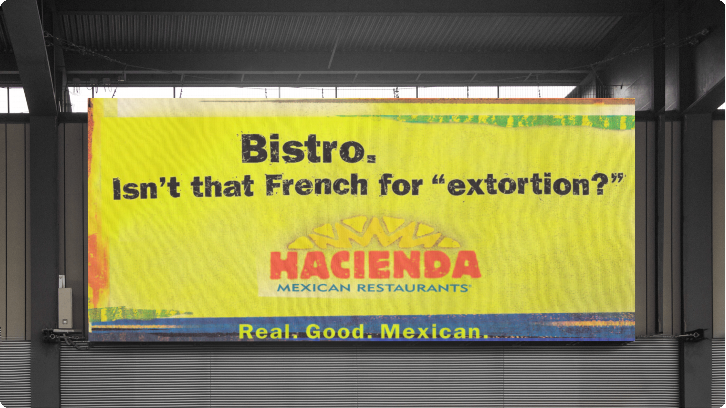 Brand Truths are two things first and foremost. They are human and they are honest. And that honesty can sometimes come from unexpected places. Hacienda - a small Indiana-based Mexican restaurant chain - had their eyes on expansion. To more cities in Indiana as well as into neighboring states. When their account crossed my desk they were going about this by adding high-end, upscale items to their menu in order to appeal to the more sophisticated palates of people in larger cities. It wasn’t working. Then one night over maybe one too many margaritas, their VP of Marketing said this - “I’m going to be honest. We’re the Wal-Mart of Mexican restaurants. And that’s when the light came on. Hacienda wasn’t fussy, it was casual. Half taqueria, half sports bar, it was the kind of place you could relax, have a beer, whoop it up and eat some tacos (or a Famous Wet Burrito). The campaign that resulted from that insight had a messy, garage band feel that was true to Hacienda’s roots. And the truth set them free. Hacienda expanded from 8 locations to 14. And that first campaign went on to win an OBIE as one of the best out-of-home campaigns in all of North America.
